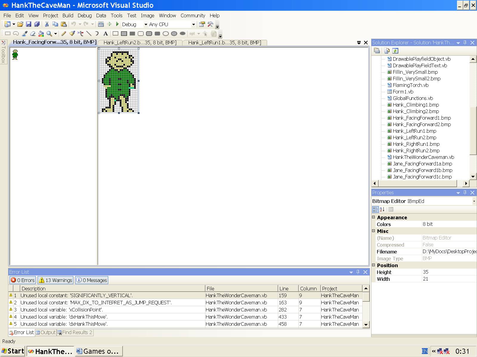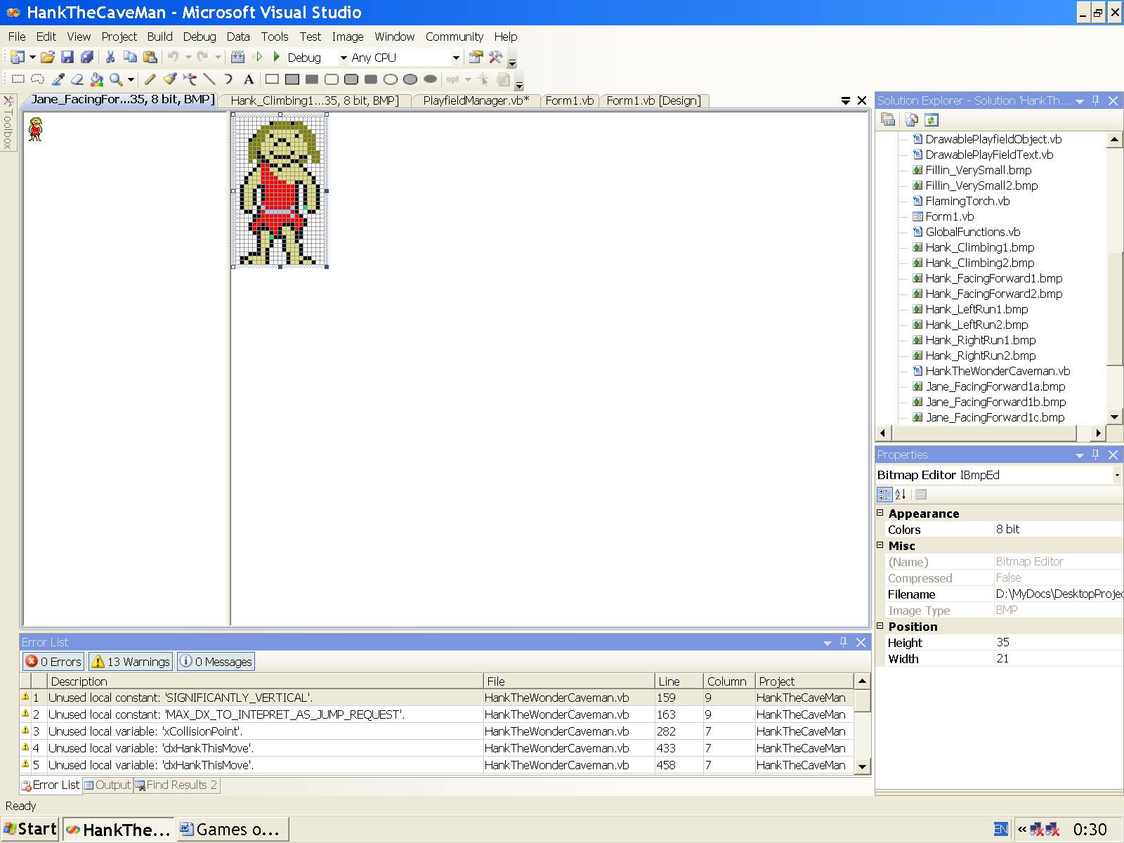 Данную игру мы будем разрабатывать, следуя проекту в заархивированном виде CaveManHank.zip (Пещерный человек Хэнк) автора Ivo Salmre от 27.6.2002 с сайта gotdotnet.com для устаревшей версии Visual Studio, причём, для карманного компьютера (КПК), но с нашими усовершенствованиями для современной версии Visual Studio, причём для настольного компьютера или планшета.