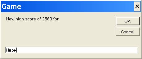 В эту панель InputBox игрок с радостью (он вошёл в тройку призёров) записывает своё имя (русскими или английскими буквами) и щёлкает кнопку OK. Панель InputBox закрывается.