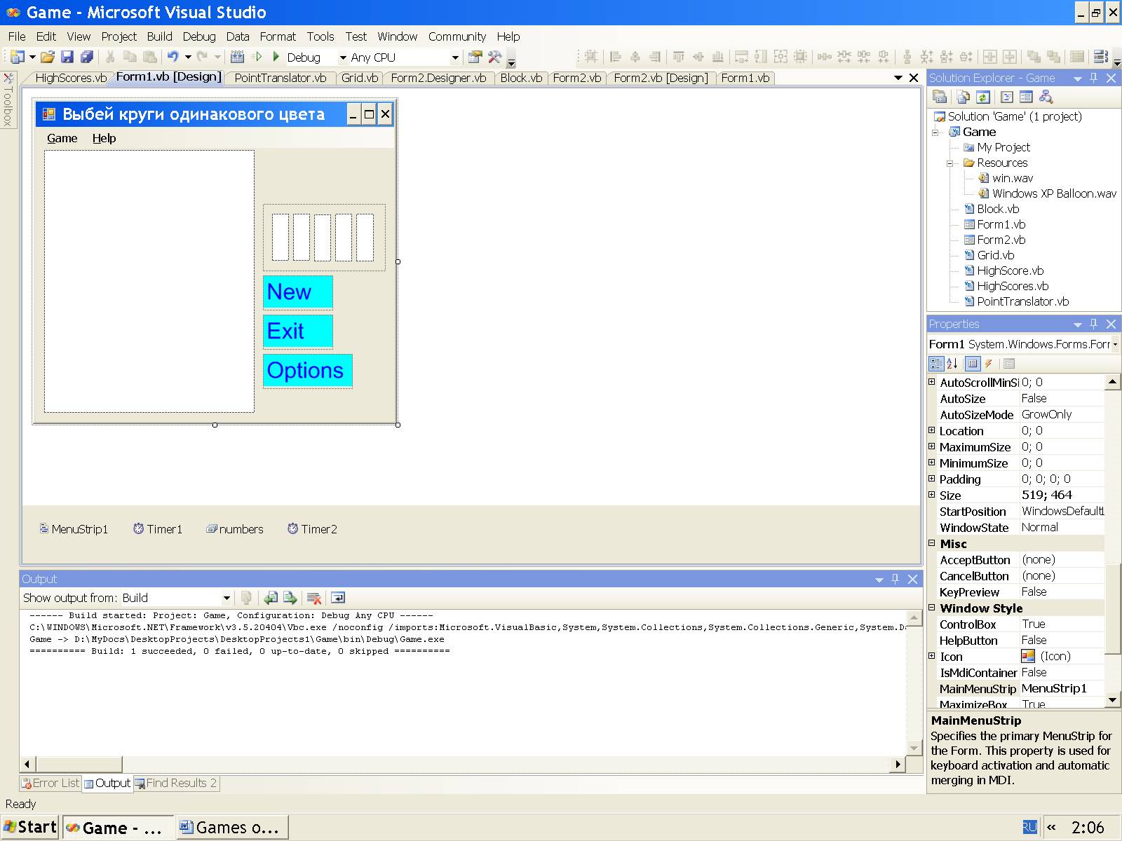 Создаём проект по обычной схеме: в VS в панели New Project в окне Project types выбираем тип проекта Visual Basic, Windows, в окне Templates выделяем шаблон Windows Forms Application, в окне Name записываем имя проекта Game и щёлкаем OK. Создаётся проект, появляется форма Form1 в режиме проектирования (рис. 20.7). Оставляем по умолчанию или проектируем форму, как подробно описано в параграфе “Методика проектирования формы”. За маркер увеличиваем размеры формы таким образом, чтобы в панели Properties (для Form1) в свойстве Size были значения, например, 519; 464. Белый цвет фона формы мы установим далее в программе (в строке Me.BackColor = Color.White).