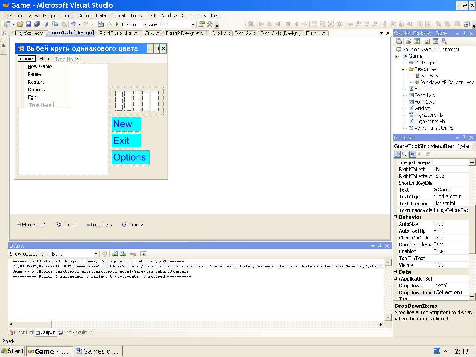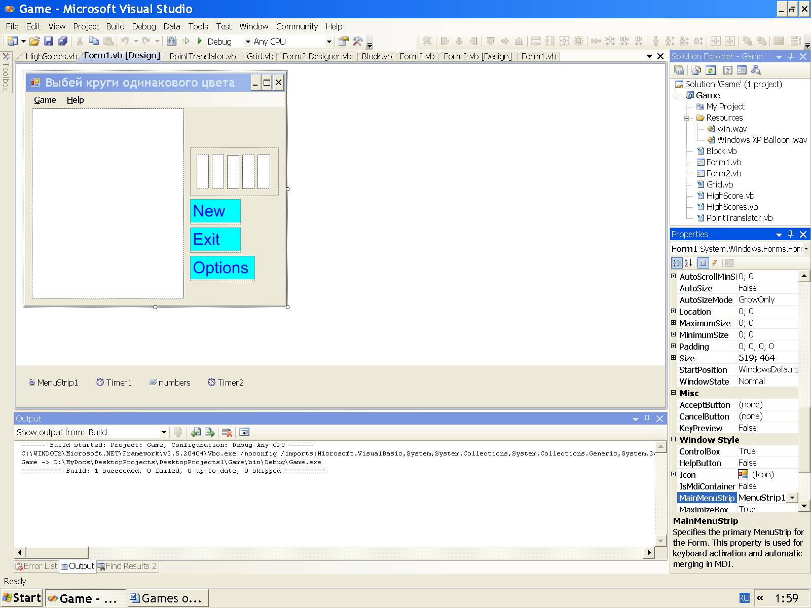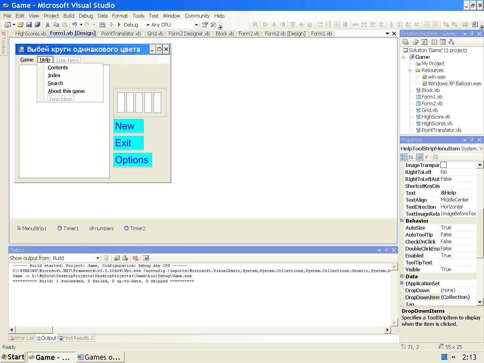 В панели Properties в свойстве Text в имени каждой команды меню MenuStrip перед соответствующей буквой записываем оператор &, после чего на форме эта буква станет подчёркнутой. Напомним, что в режиме выполнения, после нажатия клавиши Alt вместе с клавишей с подчёркнутой буквой (английского алфавита) в команде меню Game или Help, выполняется соответствующая команда.