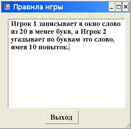 10. Теперь участники игры могут поменяться ролями. Аналогично, сначала Игрок 1 при помощи клавиатуры записывает английскими буквами, причём только строчными буквами (без нажатия клавиши Shift) загаданное им слово в окно TextBox, например, слово thanks (благодарность).