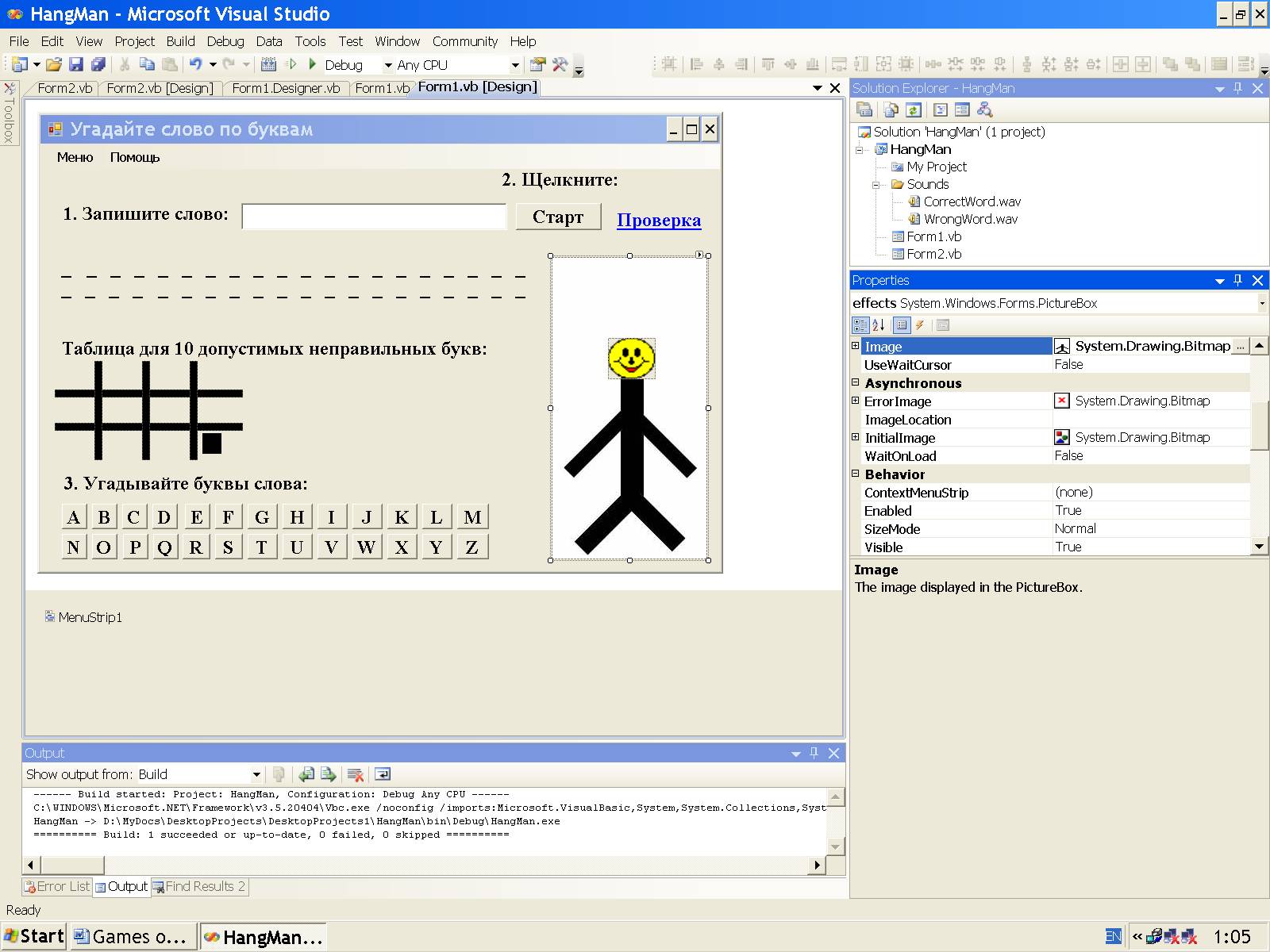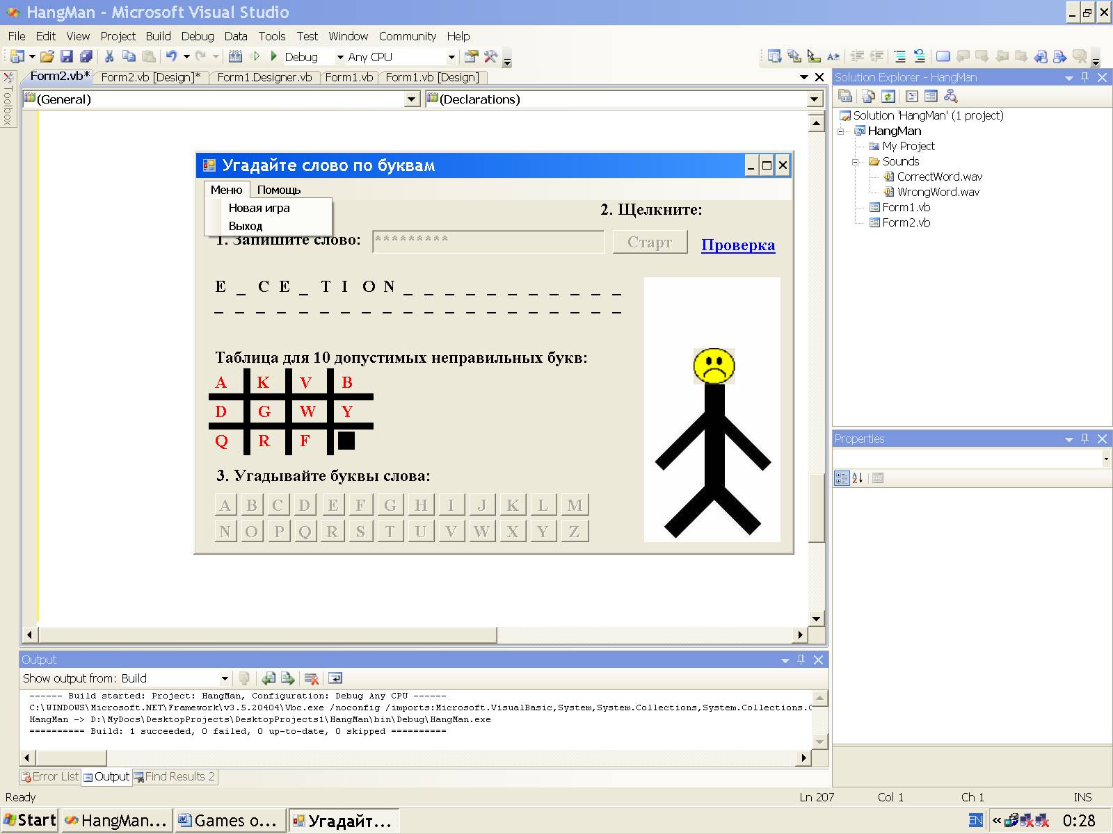 Создаём проект по обычной схеме: в VS в панели New Project в окне Project types выбираем тип проекта Visual Basic, Windows, в окне Templates выделяем шаблон Windows Forms Application, в окне Name записываем любое имя проекта, например, HangMan и щёлкаем OK. Создаётся проект, появляется форма Form1 на экране в режиме проектирования (рис. 19.15). Оставляем по умолчанию или проектируем форму, как подробно описано в параграфе “Методика проектирования формы”. Например, в панели Properties в свойстве Font выбираем шрифт Times New Roman, 14, Bold.