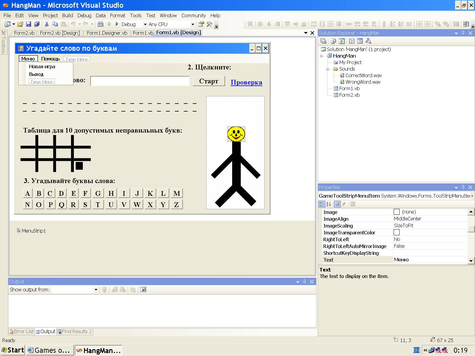 Два последних элемента управления PictureBox со смайликами накладываем один на другого на месте головы нарисованного человечка. А программа будет показывать нам либо хмурый смайлик (при неправильной букве), либо веселый смайлик (при правильной букве).