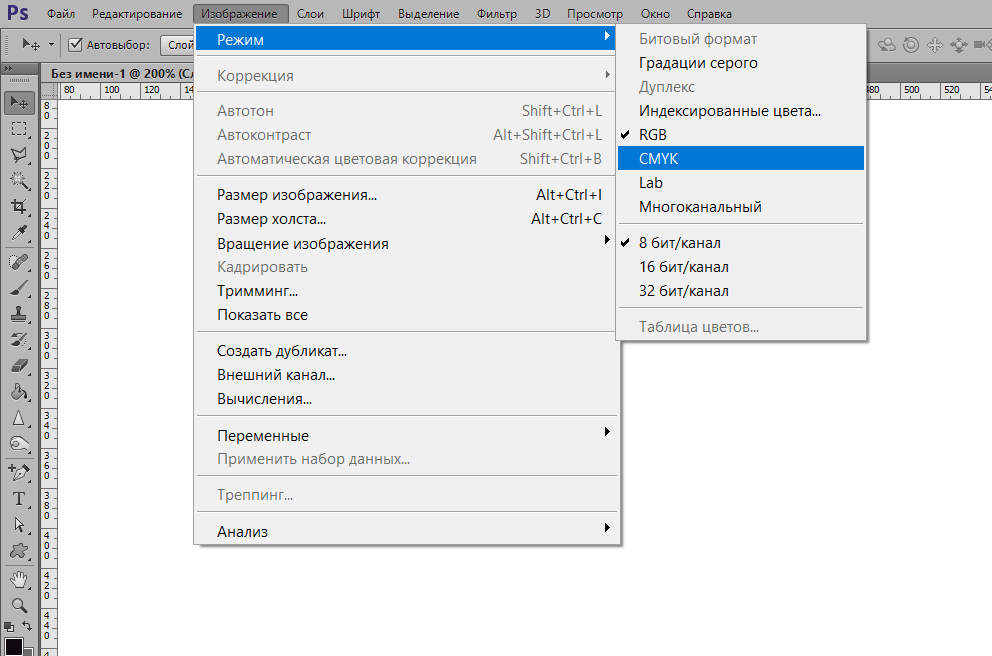 Откройте меню «Изображение». Первая строка называется «Режим», в ней как раз и представлены разные цветовые модели. Переключайтесь с RGB на CMYK щелчком левой клавиши мышки. Оттенки могут несколько измениться при переходе на другой режим, обычно CMYK использует более приглушенные цвета. См. рис.2.