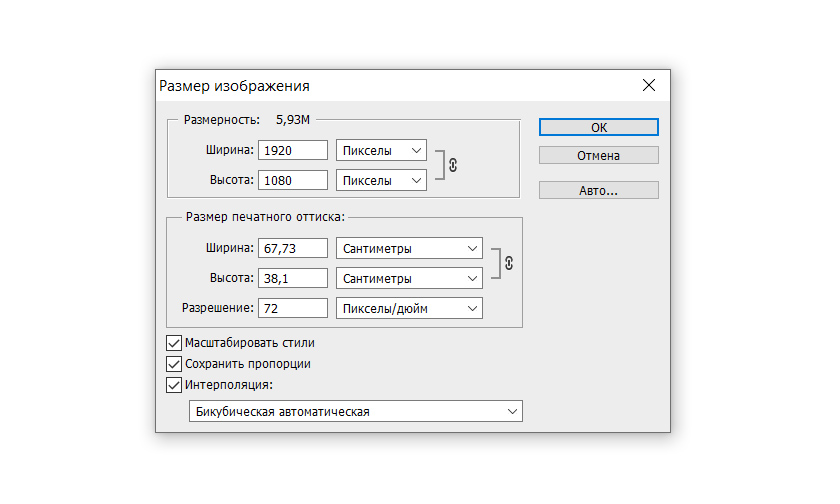Размер документа дан в сантиметрах (можно выбрать любую другую единицу измерения, например пиксели) и мы видим два типа разрешения, рассмотренных ранее. 72 пикселя на дюйм – это разрешение экрана. Если нужно хорошее качество картинки, разрешение можно изменить, поставить 300 или 600 dpi, количество пикселей тоже изменится, а вот физический размер и качество картинки нет.