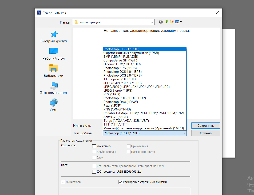 Для сохранения файла в растровый формат откройте меню «Файл» – «Сохранить» и выберите нужную папку для сохранения. Так же необходимо выбрать формат для сохранения. См. рис.5.