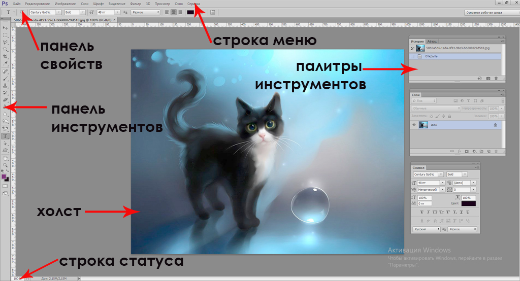 Палитры инструментов (справа на рис.3. Палитры «История», «Слои» и т.д.).