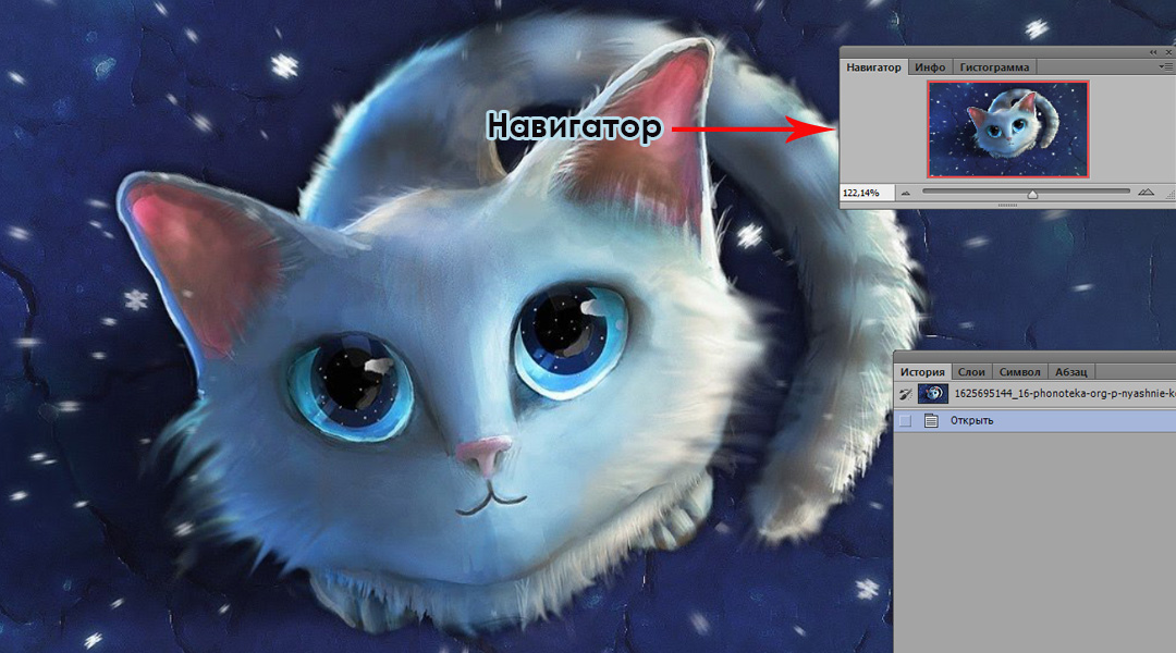Еще одна полезная палитра – «Навигатор». Она позволяет легко обращаться с масштабом изображения и внутри окна палитры выбирать нужный фрагмент изображения. Внизу окна «Навигатор» передвигайте ползунок, чтобы масштабировать изображение. См. рис. 11.
