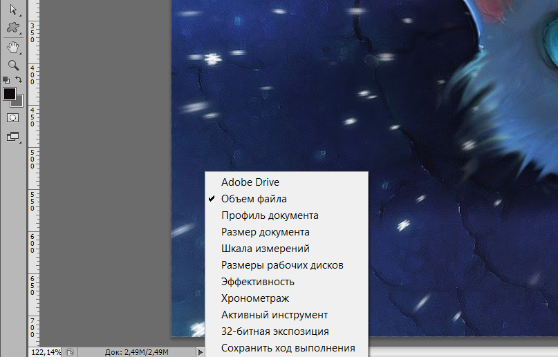 Находится строка «Статуса» внизу рабочего окна программы. Она может отображать размер документа или происходящие действия: например, заливку или применения фильтра. Пока заполняется поле, идет процесс. В маленьком черном треугольнике в конце строки спрятан ряд полезных функций. Щелчком левой клавиши мышки откройте меню строки «Статуса». См. рис. 12.