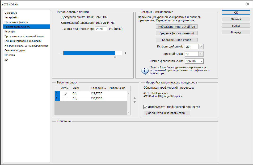 Откройте меню «Редактировать» (Edit) – «Установки» (последняя строка в меню) – «Производительность». В окошке использования памяти ставим 90 %, количество выделенной памяти увеличится. Уровни кэширования – 4, для средних размеров файлов. После этого обязательно нужно закрыть программу и открыть заново (перезагрузить), тогда изменения вступят в силу.