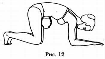 Другой вариант постановки горшка осуществляют при опущении или загибе матки у женщин. В этом случае, произведя все необходимые предварительные действия, горшок устанавливают между пупком и лобком пациентки, делается это с некоторым нажимом, до появления боли. После постановки горшка нужно 5 минут лежать на спине с согнутыми в коленях ногами, затем перевернуться на бок, а затем встать на колени и упереться локтями в поверхность кровати (рис. 12).