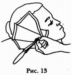 Самый распространенный способ применения воска для лечения — изготовление с его использованием специальных тканевых или бумажных «свечей», точнее, трубочек или воронок. При боли в ухе, глухоте, серных пробках в ушах нужно взять бумагу или хлопчатобумажную, льняную ткань, вырезать полоску длиной около 40 сантиметров и шириной 4–5 сантиметров и пропитать растопленным воском. Лучше всего это сделать, разогревая кусочек воска на свече и капая им на бумагу или тряпочку, как бы вычерчивая линии вверх и вниз, пока вся поверхность не покроется воском (смачивать сразу весь кусочек ткани или бумаги, окуная его в расплавленный воск, небезопасно: такая «свеча», вместо того чтобы гореть постепенно, может вспыхнуть вся сразу). Затем нужно быстро скрутить из пропитанной воском полоски трубочку, у которой один конец уже, а другой шире. Легче всего это сделать, наматывая по спирали витками пропитанную воском полоску бумаги или ткани на указку, суживающуюся к концу. Наматывая, надо следить, чтобы витки заходили один на другой и между ними не оставалось щелей. Можно делать витки, особенно верхние, в несколько слоев. Затем аккуратно вытащить указку. Должна получиться трубочка длиной примерно в 20 сантиметров с диаметром узкого отверстия 6–8 мм, широкого — около двух сантиметров. Если нет указки, можно сделать по-другому: взять не полоску ткани или бумаги, а достаточно широкий, около 20 сантиметров, кусок и, пропитав воском, свернуть его не по спирали, а просто в трубочку, слегка расширяющуюся к концу (как кулек). Когда воск застывает, трубочку прокатывают несколько раз рукой по столу, таким образом уплотняя ее, чтобы она не разворачивалась (но надо следить, чтобы отверстие не закрывалось), затем узкий конец трубочки вставляют в больное ухо, а широкий конец поджигают. Больной должен лежать так, чтобы горячий воск не капал ему в ушную раковину. Волосы нужно закрыть полотенцем, а лучше-плохо возгораемой тканью, рядом поставить кастрюлю или таз с водой (можно и всю голову накрыть тканью, сделав прорезь для уха). Пока «свеча» горит, ее надо придерживать рукой у самого уха (рис. 13).