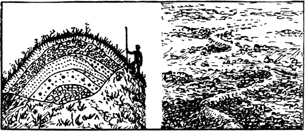 Крупный оз на равнине в Северной Америке (справа) и разрез вершины оза в Норвегии.