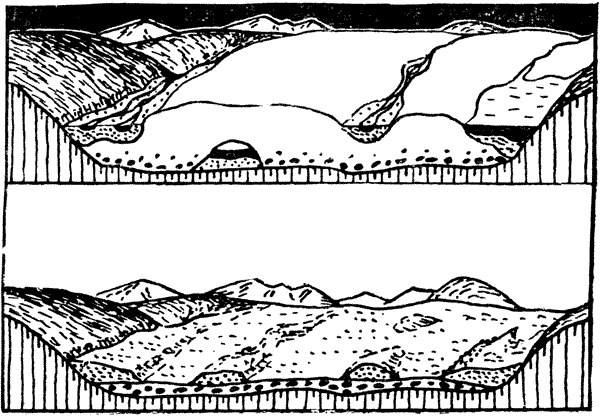 Вверху — ледник в долине; видны надледная и подледная реки, ледниковое озеро и слой морены. После ледника остаются его отложения, заметно меняющие рельеф местности.