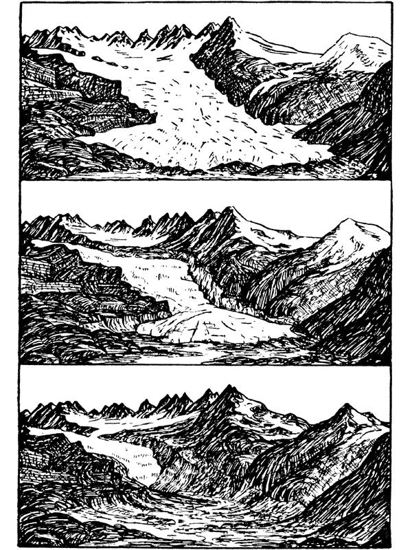 Отступание Ронского ледника в Альпах по рисункам и фотографиям (сверху вниз): 1777, 1870, 1960 годов.