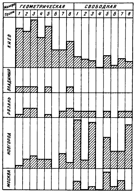 Рис 9. Диаграмма использования различных приемов изображения одежд на украшениях с перегородчатой эмалью.