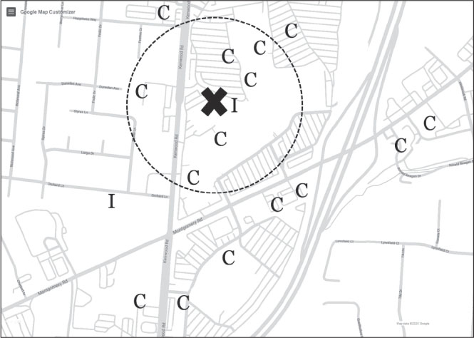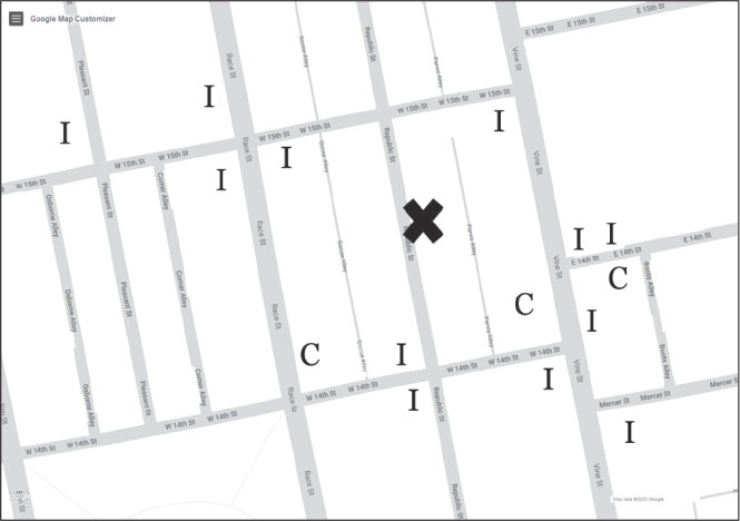 Теперь посмотрите на первое изображение на следующей странице. Новый ресторан отмечен крестиком (X), буквой C обозначены сетевые рестораны (chain), а буквой I – независимые (independent) местные закусочные. Какое предположение вы сделали бы на этот раз?