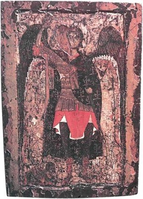 Но как ни тяжело поражение, надежда на спасение и возрождение не оставляла художника, и он воплощает эту надежду в образе архистратига Михаила. Как бы в грозе и буре явился он [604] . Фигура архангела Михаила, несмотря на небольшой размер иконы, монументальна. Чудо его явления и разящая мощь выражены точно найденным, композиционным приемом. Фигура Архангела как бы вписана в треугольник, обращенный острием вниз. В основании его рука Михаила, взмахнувшего над головой мечом. В подол рубахи, красной и белой подпушкой, дает ощущение вершины треугольника. Отсюда впечатление внутренней динамики, энергии застывшего на мгновение движения.