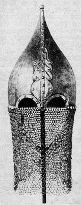 Шлем куполообразной формы с удлиненным навершием и наносником. К нижнему венцу прикреплена кольчатая бармица. Шлем украшен бронзовой накладкой.