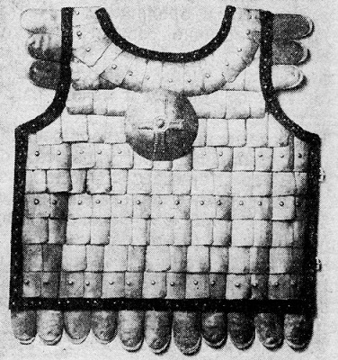 Пластинчатый доспех изготовлен наподобие куртки с застежками на груди. Он имеет юбку, состоящую из двух частей, соединенных по бокам ремнями. Каждая половина юбки имеет разрез по центру, позволяющий воину сидеть в седле. Пластины квадратные, размером 6x6 см. Для оторочки и украшения доспеха использовались пластины других размеров, по ширине от 4 до 9 см и по высоте от 6 до 12 см. Пластины выгнуты, имеют по четыре отверстия для крепления к мягкой основе. На изготовление доспеха пошло около 350 пластин (вес — 9 кг).
