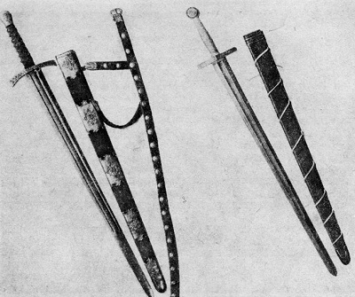 В конце XIV в. меч постепенно вытесняется саблей, как более современным оружием. Но, к сожалению, не известно ни одной точно аннотированной русской сабли XIV в., в то время как мечи хорошо известны. Кроме того, меч для XIV в. был символом борьбы русского народа против иноземного ига и как бы противостоял золотоордынской сабле. Именно поэтому он и занял основное место в реконструируемом комплексе. Был воссоздан меч с рукояткой «в полторы руки».