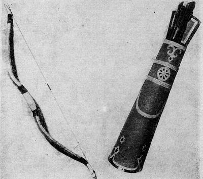 Лук деревянный, оклеенный берестой, с кожаной тетивой. Налучь кожаная, украшенная аппликациями. Колчан для стрел имеет деревянный каркас, обтянутый кожей и украшенный аппликациями.