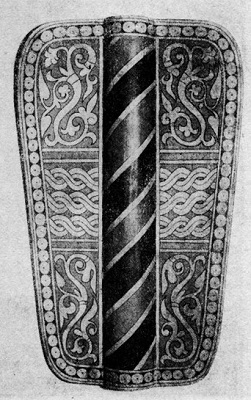Щит круглый, металлический, обтянутый холстом и украшенный орнаментом. По краям он усилен двумя рядами бронзовых заклепок.