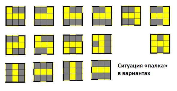 Следующая по лёгкости ситуация – ситуация палка. Общий признак ситуации – два рёберных кубика с центром выстроены вдоль прямой.