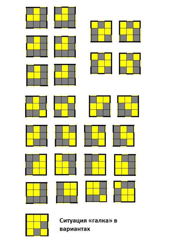 Ситуация «галка» в вариантах. Общий признак «галки» кубики 2ребра и центр образуют угол или галку.