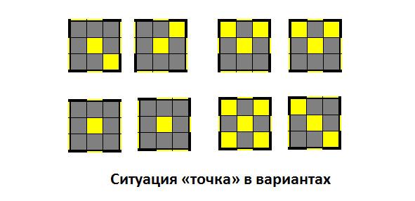 Ситуация «точка» характеризуется тем, что ни один рёберный кубик не перевернут в цвет шапки (жёлтой стороной).