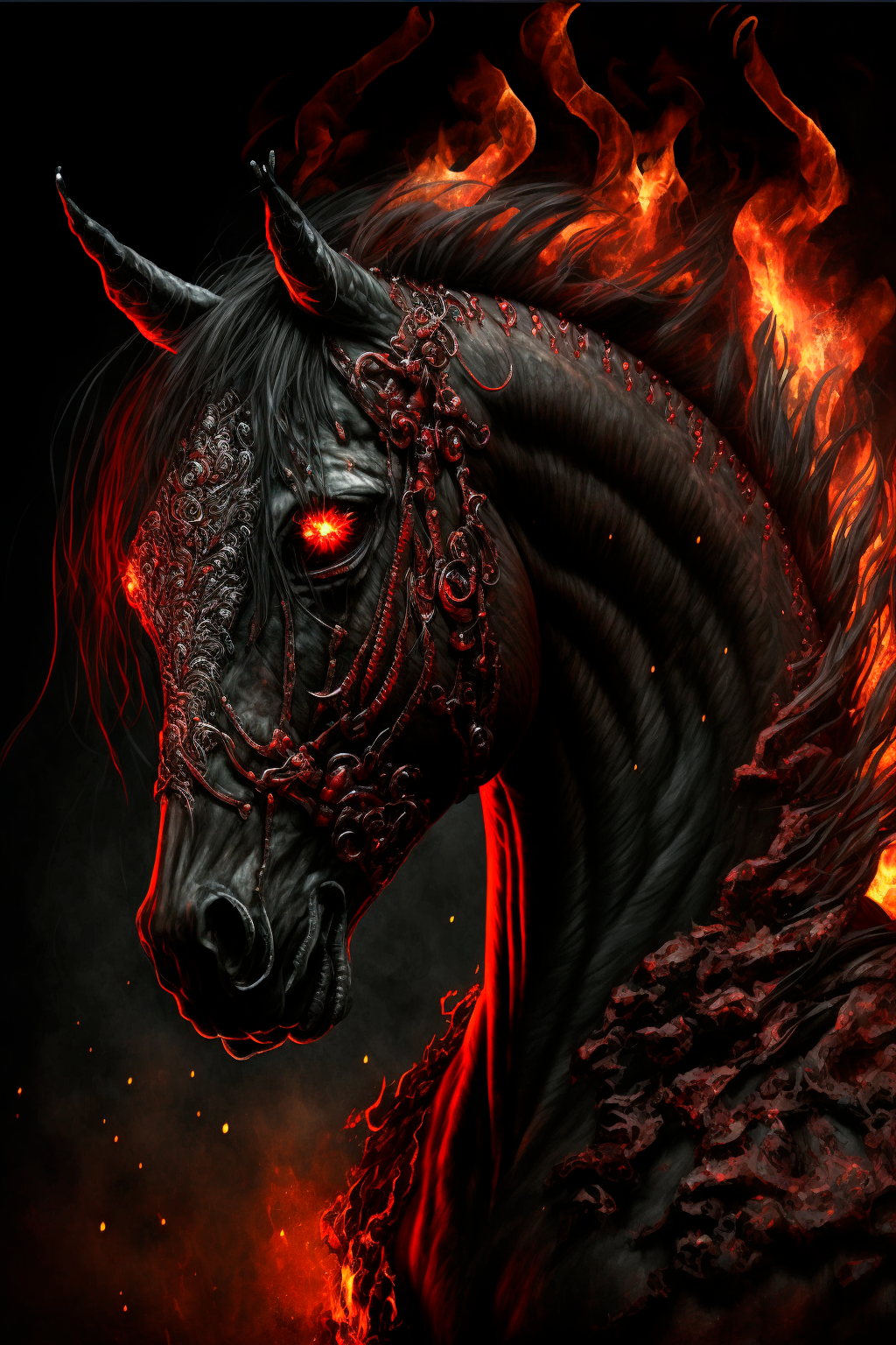 Чёрная скотина явно не была живой, все её ребра обтягивала шкура, но в некоторых местах было видно, что внутри ничего нет. Огонь всполохами пробегал по телу животного, а алая витая сбруя придавала скотине адский вид.