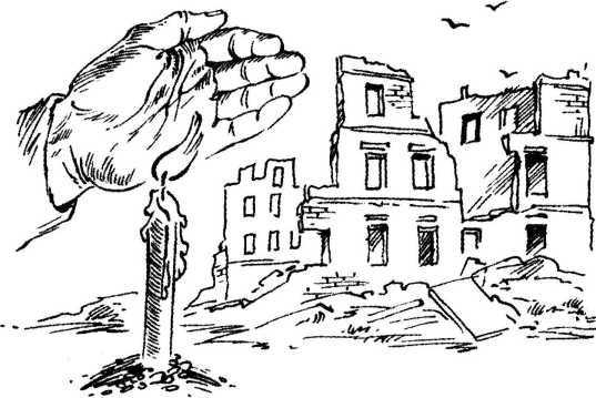 Около разбитой ограды сквера, над засыпанной землей воронкой от снаряда высился маленький холмик. В головах его был воткнут полукруг горелого железа. Прикрытая им от ветра, внутри тихо догорала свеча. Огарок уже оплывал, но маленький огонек все еще трепетал, не угасая.