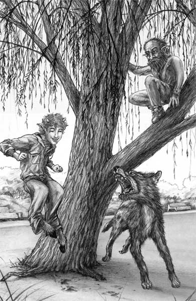 – Бежим!!! – крикнул он пронзительно, с силой толкая домового вперёд, туда, где посередине большого газона, окружённого живой изгородью из боярышника, возвышалась огромная, раскидистая ива. И Афанасий побежал. Побежал настолько быстро, насколько мог. Только куда ему было угнаться за быстроногим сатиром… Домовой начал стремительно отставать с первых же метров «дистанции». Афоня уже ощущал спиной горячее дыхание страшного пса… И тут Сатирик снова пришёл на помощь. Притормозив на секунду и дав домовому себя догнать, сатир мёртвой хваткой вцепился в его спортивную куртку. Афанасий почувствовал, что его ноги почти не касаются земли, а между тем двигаться он стал гораздо быстрее. Вот уже колючие заросли боярышника… Сатир невероятным прыжком, держа одной рукой живую ношу, перемахнул через них. Бейсболка слетела с головы Афони и повисла, раскачиваясь, на одной из колючих ветвей. А стремительный сатир уже карабкался, скорее даже взбегал, по стволу ивы, по-прежнему волоча за собой домового. На их счастье, дерево росло не прямо, а несколько наклонившись. Лишь усевшись, как куры на насесте, на толстой ветви, метрах в четырёх над землёй, друзья смогли перевести дух. Вернее, дух переводил совершенно запыхавшийся домовой. Сатирик же будто и не устал вовсе. Достав из сумки флейту, он начал наигрывать на ней что-то мелодичное и задумчивое, видимо, надеясь музыкой успокоить пса.
