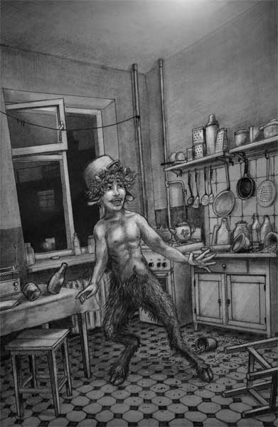 И тут Афанасий невольно открыл рот, удивившись настолько, кажется, впервые за последние лет четыреста. Посреди кухни, покачиваясь на своих козлиных ногах, стояло то самое чудо чудное из книги. Похоже оно было на козла и нахального, бесцеремонного мальчишку одновременно: ехидная физиономия со слегка раскосыми глазами, худощавое человеческое туловище, крепкие, мускулистые руки, кривоватые, покрытые рыжей шерстью ноги и короткий пушистый хвост. На голове у козлочеловека, подобно древнему шлему, была надета одна из рухнувших с полки кастрюль. Незнакомец дробно застучал по полу копытцами и громко чихнул. Кастрюля слетела с его головы, открыв пару козлиных рожек. Затем пришелец заговорил на каком-то странном языке. Вначале домовой не понял ни слова, а потом, словно сквозь пелену, начал медленно пробиваться смысл отдельных слов, потом больше, больше… Афанасий, понимавший доселе из чужих наречий лишь язык голубей, воробьёв да невразумительное бормотание соседа-пьяницы, что иногда заходил к хозяину клянчить на бутылку, даже не удивился таким своим способностям. Он на время утратил способность удивляться.