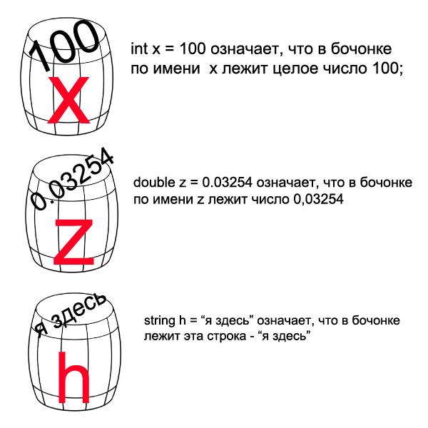 Переменные – это буквенные символы, содержащие в себе значения какого-либо типа. Переменные – это бочонки, в которых что-то лежит.