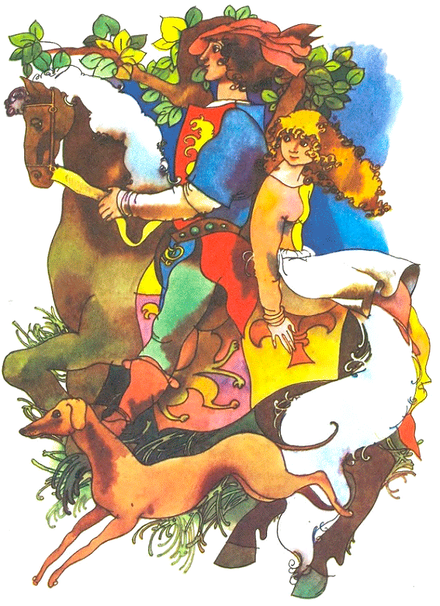 И они поскакали — принц и Кэт — через зеленый лес. Собака бежала впереди и показывала дорогу. А Кэт рвала на скаку спелые орехи и прятала их в карманы.