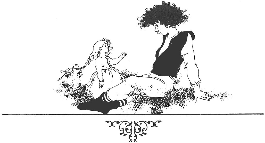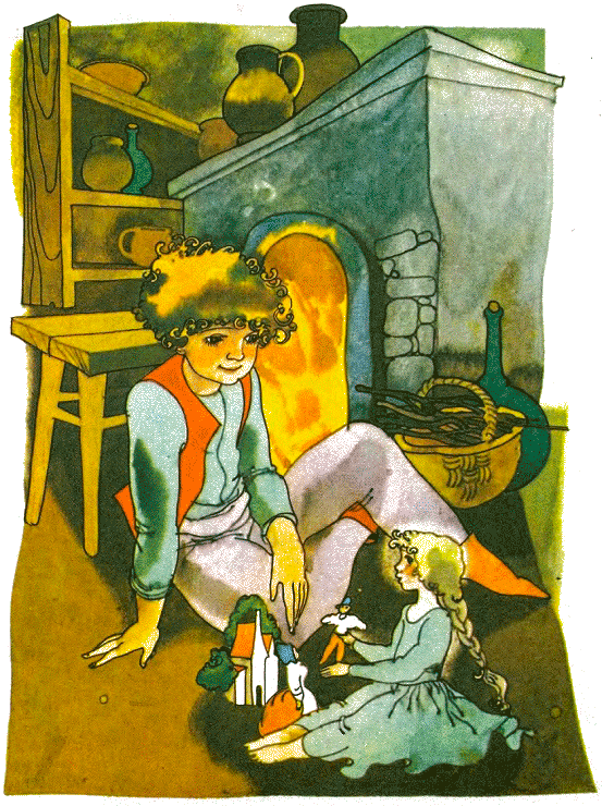 Но недолго он просидел один. В каминной трубе вдруг что-то зашуршало, и перед парнем появилась маленькая девочка: высотой менее пяди, косы белокурые, словно бы серебряные, глаза зеленые, а щечки румяные, как вишенки. Удивился мальчик.