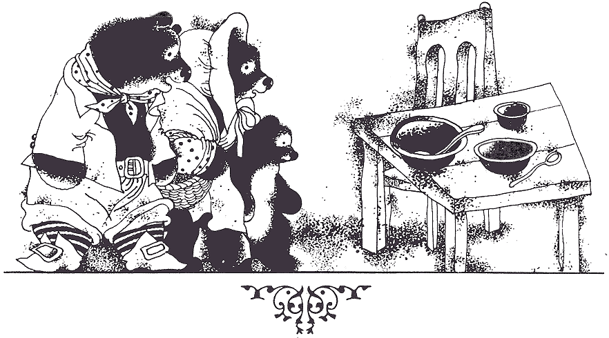 Сперва она попробовала каши из горшочища большого-здоровенного медведища, но каша показалась ей слишком горячей, и старушонка сказала: «Дрянь!» Потом отведала каши из горшка среднего медведя, но его каша показалась ей совсем остывшей, и старушонка опять сказала: «Дрянь!» Тогда принялась она за кашу маленького-малюсенького крошки-медвежонка. Эта каша оказалась не горячей, не холодной, а в самый раз, и так понравилась маленькой старушонке, что она принялась уплетать ее за обе щеки и очистила весь горшочек до донышка. Однако противная старушонка и эту кашу обозвала скверным словом: очень уж мал был горшочек, не хватило старушонке каши.