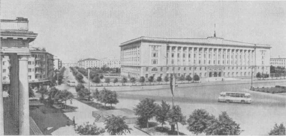ГОРОДСКИЕ ПЛОЩАДИ. Главная административно-общественная площадь Новгорода - площадь Победы - была создана после войны по проекту А. Щусева. Площадь Победы надо рассматривать вместе с кремлевским комплексом как единое целое. Статический центр композиции Новгорода - кремлевский комплекс - окружает зеленая полоса парка, который в своей средней части (по оси кремлевского проезда) разорван уширенным проездом трапецеидальной формы, переходящим в площадь Победы. Замыкается площадь Домом Советов [48], поставленным по оси кремлевского проезда. На юге площади размещается трехэтажное здание филиала ЛЭТИ [49]. Реконструированное к концу 1955 года первоначально для нужд областной партийной школы, в 1961 году оно передано институту. Надстроив третий этаж, пристроив портик и убрав часть декора, проектировщики придали ему более простой и вместе с тем монументальный вид, соответствующий его местоположению в непосредственной близости от кремлевского комплекса. Трехэтажное здание стало более масштабным по отношению к площади Победы.
