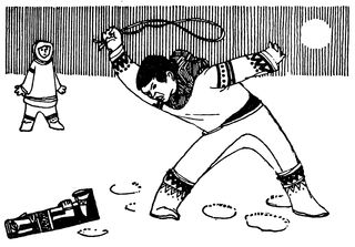 Возвращается охотник домой довольный, увешанный добычей, снимает с полки маленького деревянного божка и мажет ему губы нерпичьим салом. Мажет и приговаривает: