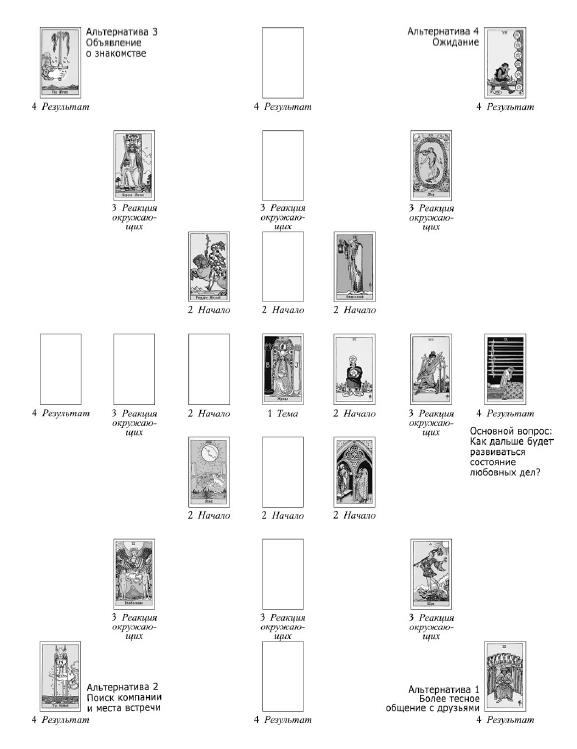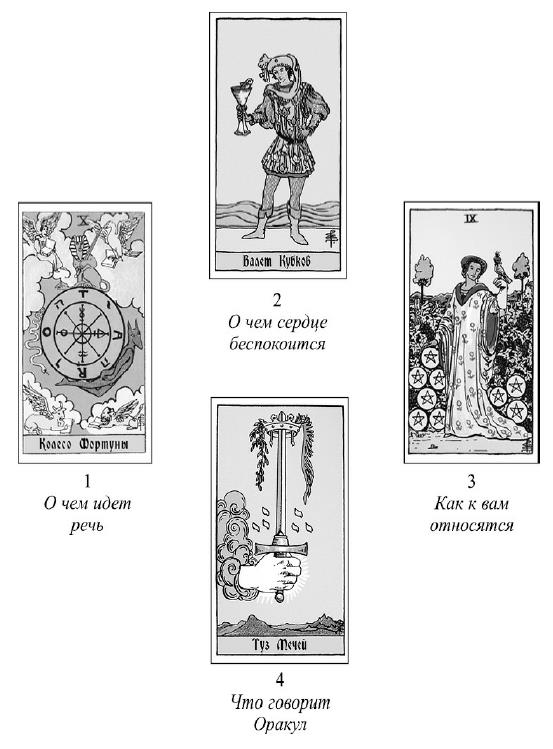 Если вы спрашиваете о любви и взаимоотношениях, тогда вам более всего подходит расклад «Оракул любви». С его помощью вы можете выяснить, как к вам относится интересующий вас человек или на что вас вдохновляет Оракул, то есть какой он вам дает совет. Типичный вопрос, который задают этому раскладу, таков: «Каковы мои взаимоотношения с этим человеком?» Давайте рассмотрим следующий пример. Из него можно сделать следующий вывод: