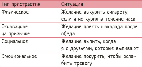 Выясним, когда у вас проявляются пристрастия. Осознание пристрастий и понимание того, почему они возникают, – это первый шаг к эффективному управлению своими пристрастиями и жизнью. Это первый шаг в разработке плана. В приведенной ниже таблице даны примеры распространенных пристрастий. Запишите в дневнике или блокноте каждый тип пристрастий (физические, основанные на привычке, эмоциональные, социальные) и перечислите как можно больше ситуаций, когда вы испытываете сильное желание употребить какое-либо вещество. Или же начните с перечисления ситуаций, в которых проявляются пристрастия, а затем решите, какой тип пристрастий соответствует каждой ситуации.