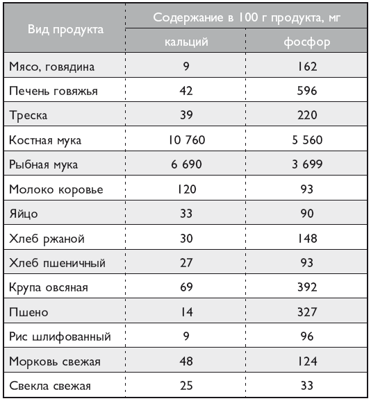 Особенно большое значение для растущего организма щенка имеют кальций и фосфор. Кальций служит материалом для построения костей, он необходим для нормального роста всех клеток и для свертываемости крови, регулирует нормальную деятельность нервной системы и сердца. Фосфор также входит в состав костей, он необходим для работы нервной ткани и особенно мозга, играет значительную роль в углеводном обмене. Содержание кальция и фосфора в продуктах представлено в таблице.