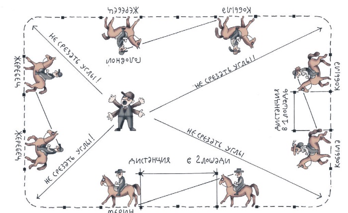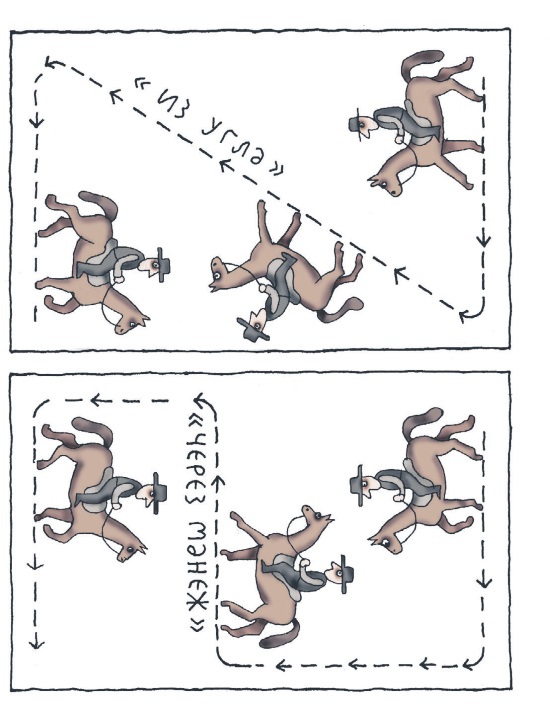 Если вы занимаетесь в группе совместно с такими же начинающими всадниками, то ездить вы будете в смене, т. е. передвигаться вдоль стен манежа цепочкой друг за другом с указанным тренером интервалом. Едущий впереди всадник называется головным. Обычно лошадей в смене ставят таким образом – впереди жеребцы, за ними мерины и кобылы. Делается это для того, чтобы избежать игр и «выяснений отношений» между лошадьми. При езде в смене очень важно соблюдать дистанцию, т. е. расстояние от головы вашей лошади до хвоста предыдущей. Тренер может потребовать сократить или увеличить это расстояние, но, как правило, начинающие всадники едут в смене с дистанцией в две лошади. Проверить ее можно так – между ушей вашей лошади должны быть видны щетки задних ног лошади, идущей впереди. При дистанции в одну лошадь всадник должен видеть скакательный сустав лошади, идущей перед ним.