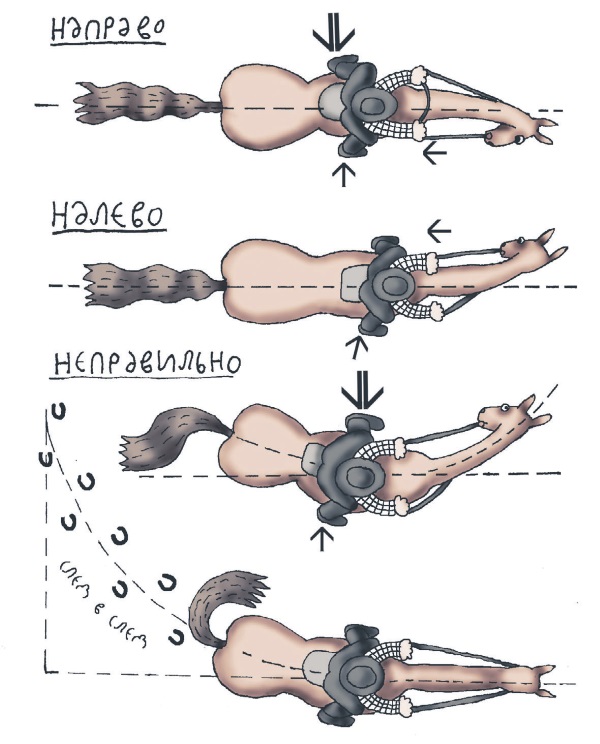 Шаг, как и любой аллюр, может быть сокращенным, средним или прибавленным. Для того чтобы перейти на сокращенный шаг, всадник набирает поводья, и лошадь уменьшает ширину шага. Чтобы перейти на прибавленный шаг, нужно усилить воздействие шенкелей на бока лошади. Обязательным элементом езды в манеже является перемена направления. Выполняется она несколькими способами. При перемене направления «из угла» всадник едет по диагональной линии, соединяющей углы манежа через его центр. «Через манеж» двигаются под прямым углом от одной длинной стенке манежа к другой. При переменах направления отрабатывается навык управления лошадью на поворотах. Чтобы заставить лошадь повернуть, нужно мягко набрать внутренний повод и поработать шенкелями, иначе под воздействием повода лошадь замедлит шаг или остановится. При повороте направо усиливают воздействие левого шенкеля, при повороте налево – правого. Всадник отклоняет корпус в сторону поворота. Силу воздействия шенкелей нужно регулировать таким образом, чтобы лошадь, изгибаясь в боку и входя в поворот, не уводила заднюю часть корпуса далеко в сторону. При выполнении поворота задние ноги лошади должны попадать в следы передних.