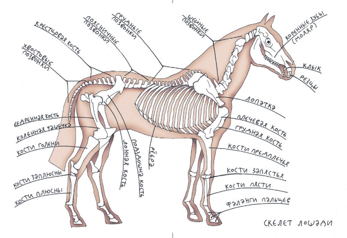Природа-матушка постаралась на совесть, создавая такое быстрое, сильное и выносливое животное, как лошадь. От скелета и мускулатуры зависят форма тела и работоспособность животного. Скелет лошади полностью развивается только к пятилетнему возрасту. Он состоит из 252 покрытых надкостницей костей. Сама кость пронизана сетью питающих ее кровеносных сосудов, а надкостница обильно иннервирована, т. е. в ней сосредоточено множество нервных окончаний. Кости лошади состоят из органических, отвечающих за относительную упругость, и минеральных, придающих костям необходимую твердость веществ. Каждая из костей несет определенную нагрузку. Кости ног приспособлены как для быстрой скачки, так и для перемещения тяжестей, ребра предохраняют от повреждений внутренние органы, но не мешают движению и дыханию. У верховых пород лошадей не только кости ног, но и мышцы тоньше и длиннее, чем у тяжеловозов.