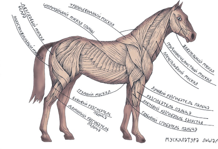 Каждая мышца лошади выполняет определенную функцию, имеет свойственную ей форму и состоит из нескольких тканей. В состав мускула входят поперечно-полосатая мускульная ткань, соединительная ткань, кровь и нервная ткань. Мышечные волокна обладают особенной способностью сокращаться. При сокращении мышечное волокно становится толще и короче. Затем наступает расслабление, которое выражается в том, что мышца возвращается в свое прежнее состояние, делаясь тоньше и длиннее. Все движения лошади, по сути, и есть попеременное сокращение и расслабление тех или иных групп мускулов. Мышцы прикрепляются к костям посредством сухожилий, состоящих из объединенной в пучки плотной соединительной ткани. Одним концом сухожилие соединяется с мускулом, а другим – с одной или несколькими костями.