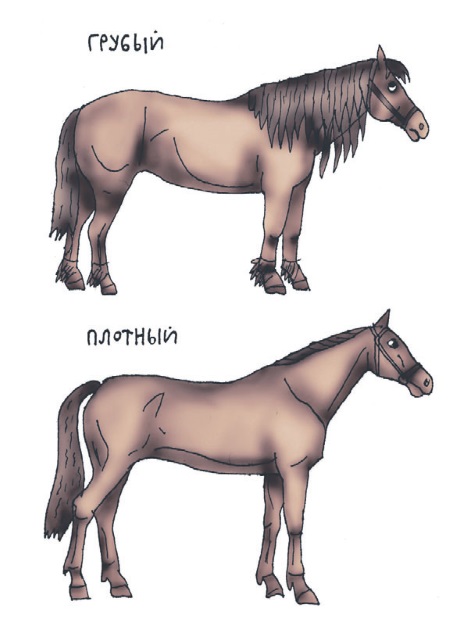 Грубый тип – массивный костяк, объемистая мускулатура, толстая кожа, покрытая грубым волосом. У лошадей такой конституции обычно более густые грива, хвост и щетки. Все части тела лошади внушительные, объемистые, широкие, но жирным такое животное не назовешь.