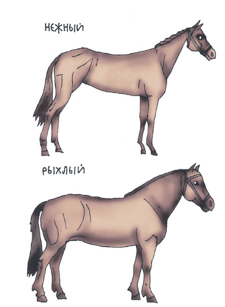 Нежный тип – тонкий, но крепкий костяк, не очень объемистая мускулатура, тонкая кожа, покрытая коротким и нежным волосом. У этих лошадей небольшая, легкая голова, изящная шея, тонкие ноги. Кожа легко оттягивается, часто образует складки, например на шее. Ткани настолько тонки, что у таких лошадей могут просвечивать на солнце уши и носовая перегородка.