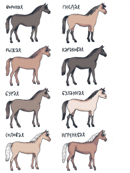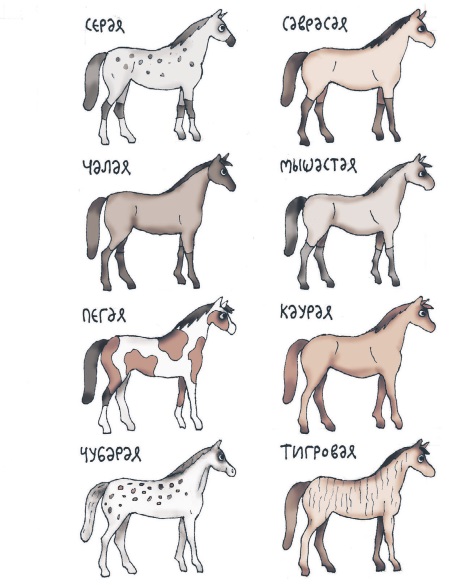 • саврасая – красновато-желтая или светло-желтая окраска туловища, нижняя часть которого более светлая. Грива и хвост черно-бурые, на ногах часто бывают поперечные темные полосы – «зеброидность», вдоль спины и крупа тянется черный «ремень»;
